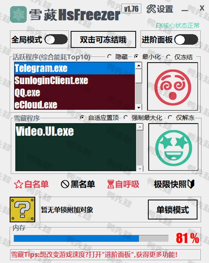 这是一款让你可以随心冻结游戏的软件(游戏暂停软件、系统优化软件、进程管理软件、进程变速软件等),想玩就玩,想停就停,快捷键随心瞬发,单锁模式极致的丝滑切换,各种功能精心打磨,不断迭代, 当然,雪藏HsFreezer不止适用游戏!更有丰富的特色系统优化功能,有待您的体验与挖掘!